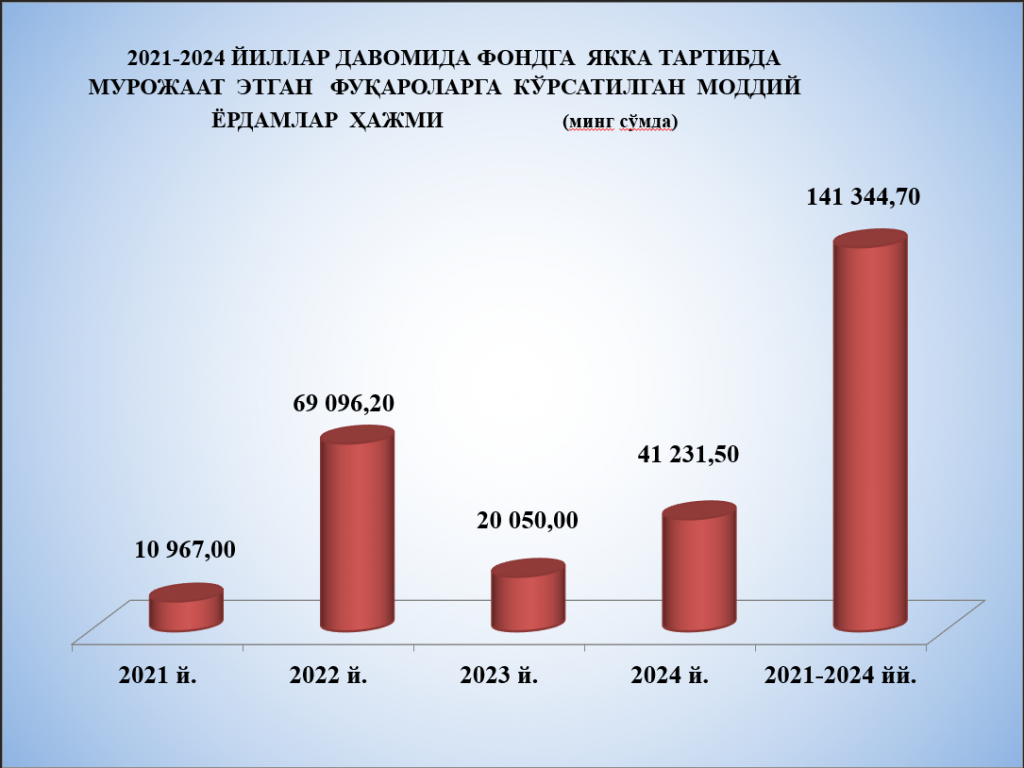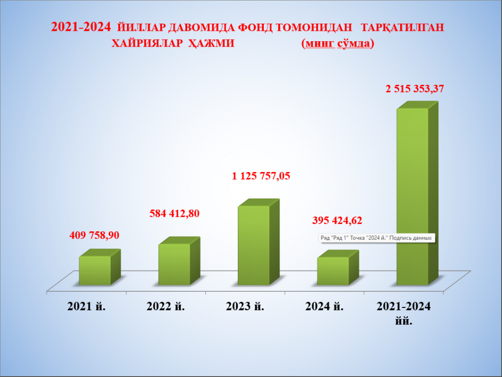 Ўзбекистон Республикаси «Анемия ва лейкемия» хайрия жамоат фонди 2021-2024 йилларда қўйидаги хомийлик ёрдамларини кўрсатди (минг сўмда)