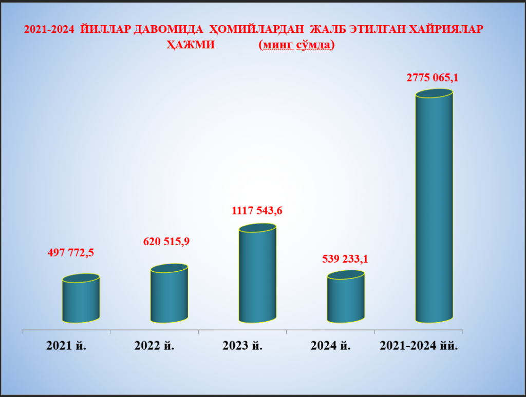 Фонднинг Наманган вилояти филиали | 2 392,50 | 1 050,00 | 355,0 | 70,0 | 3 867,5 |